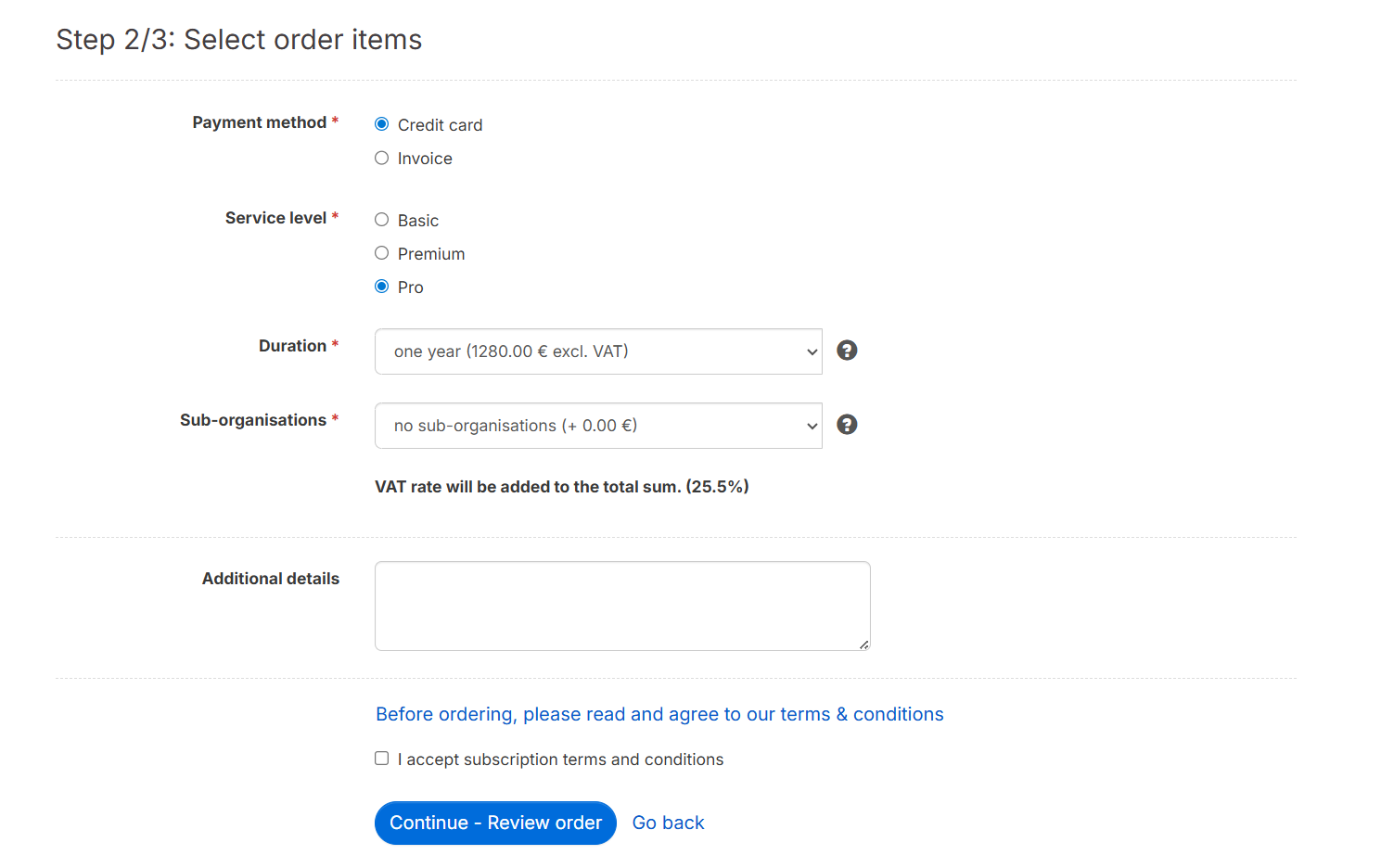 VAT number is used in the EU area to prove that an organisation is registered for value-added tax. If the subscriber doesn’t have a VAT number, the current VAT rate of the subscriber’s country will be added to the total sum. If the subscriber is from a non-EU country, VAT will not be added to the total sum.