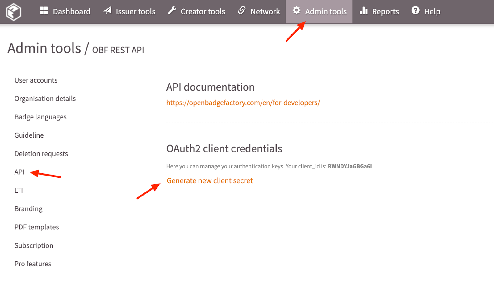 You need to generate an API key from OBF. Log in to Open Badge Factory and go to Admin tools > API
