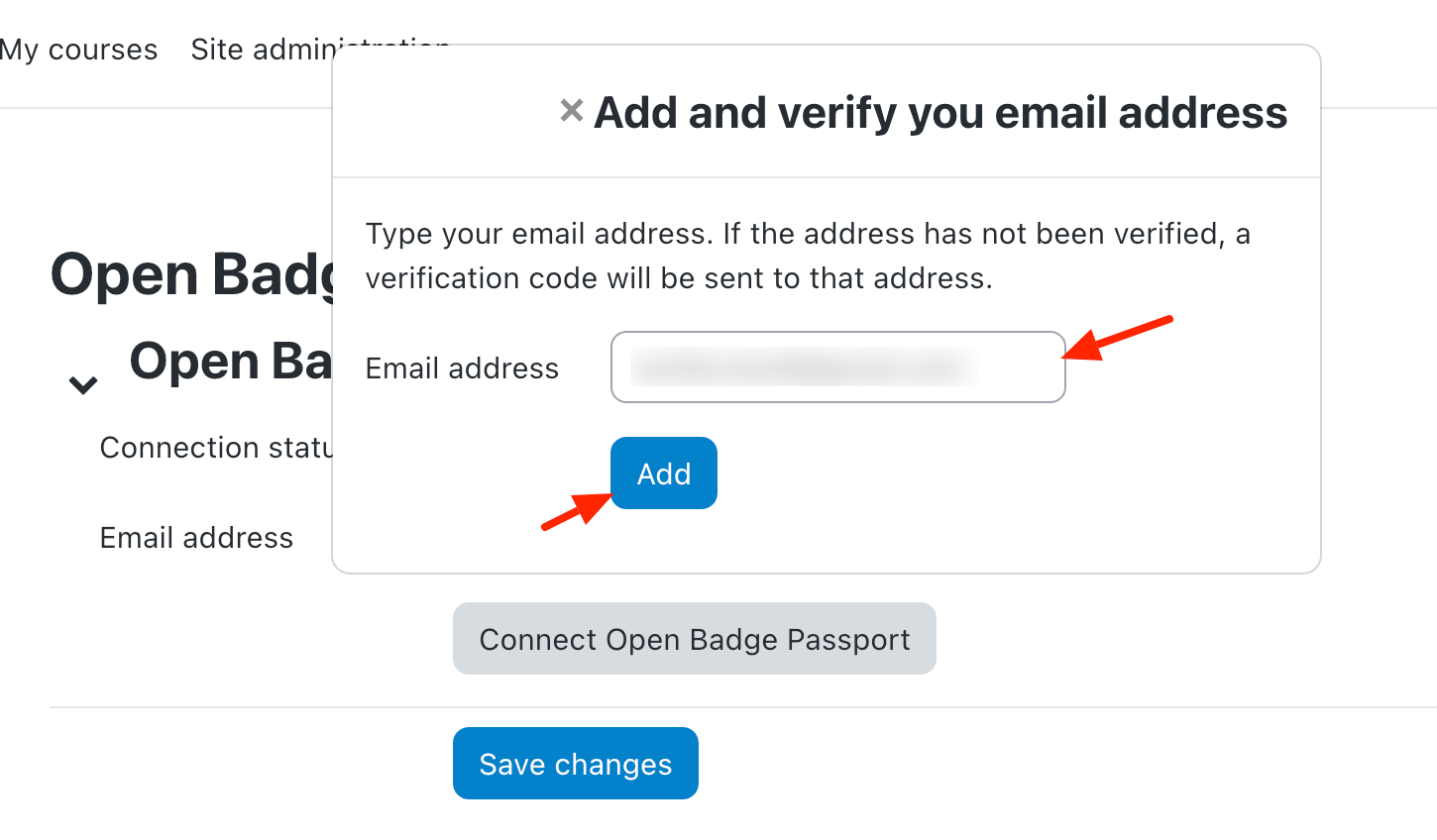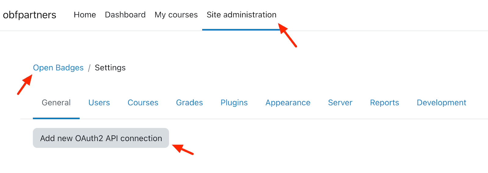 Log into Moodle as a Site Administrator and add the API key you copied from OBF to Site administration →