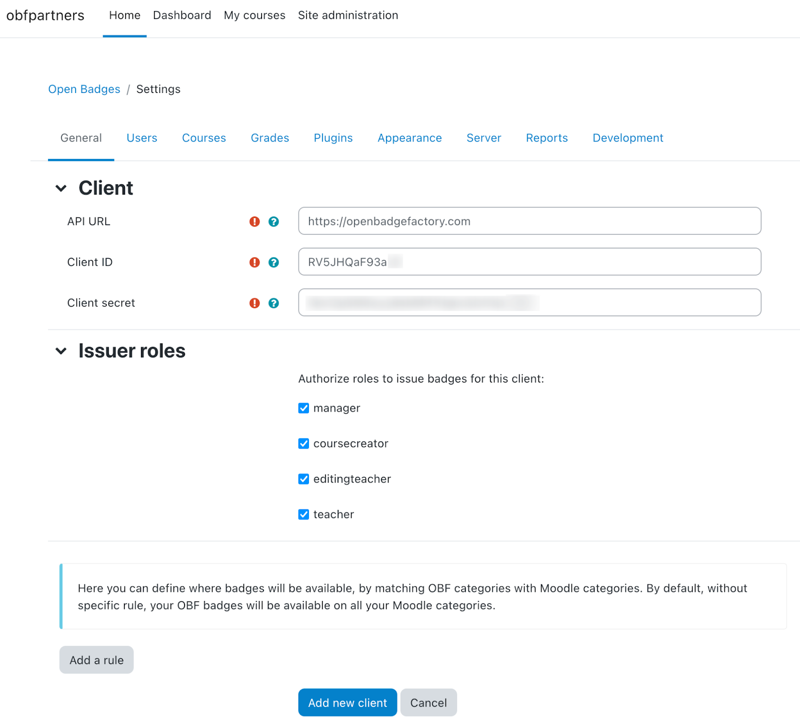 Paste your client_id and client_secret, set roles authorised to issue badges and click Add new client :