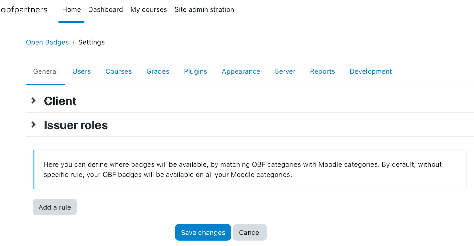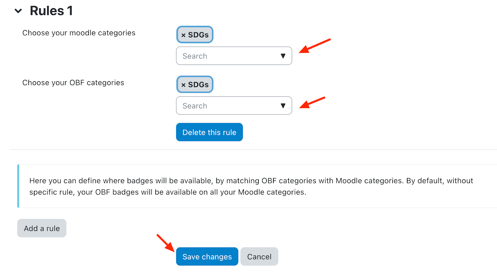 - Without any specific rules, your OBF badges will be available on all your Moodle categories.
