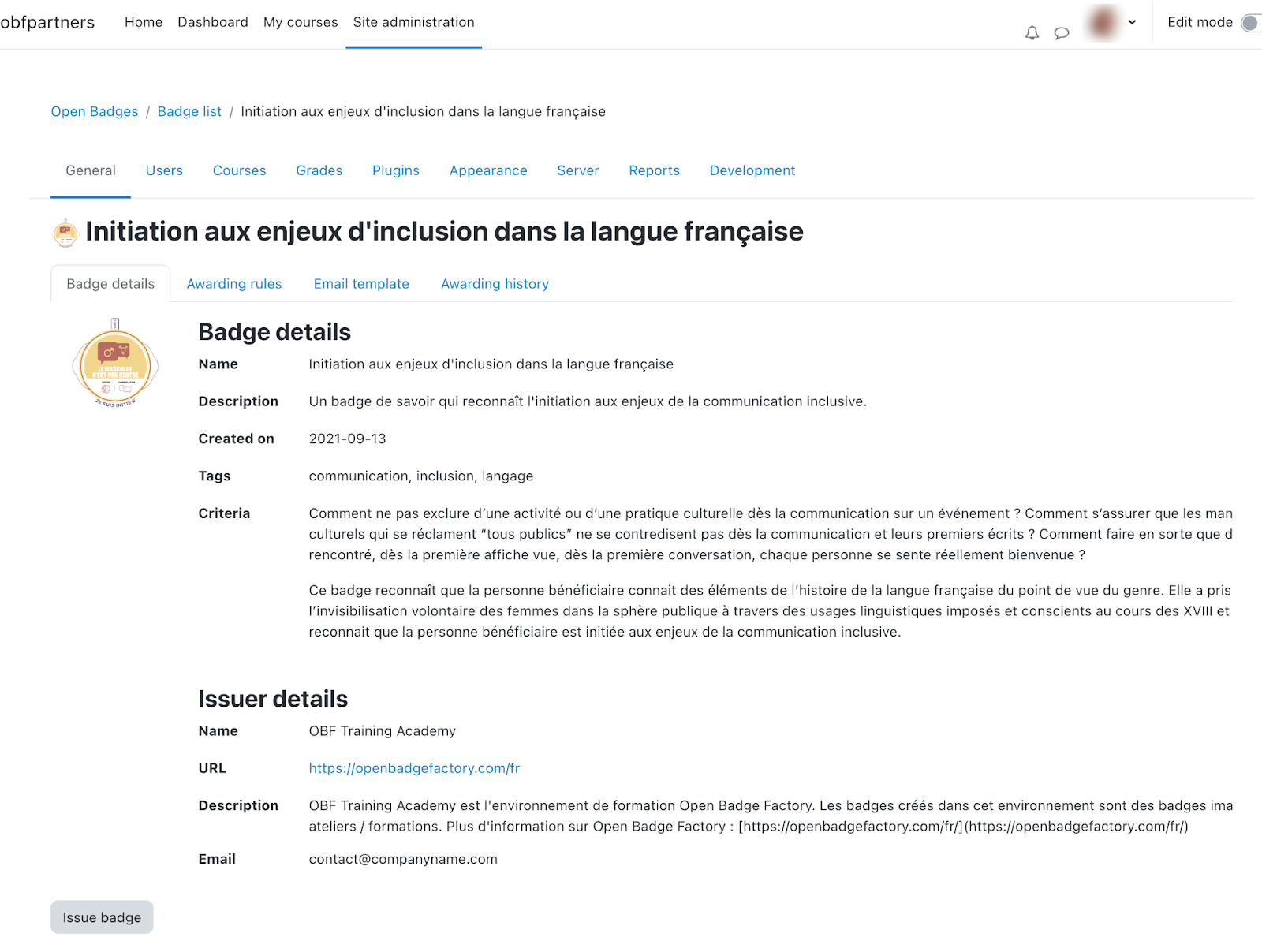 This article explains how to issue Open Badges from Moodle using Open Badge Factory via the local_obf plugin.