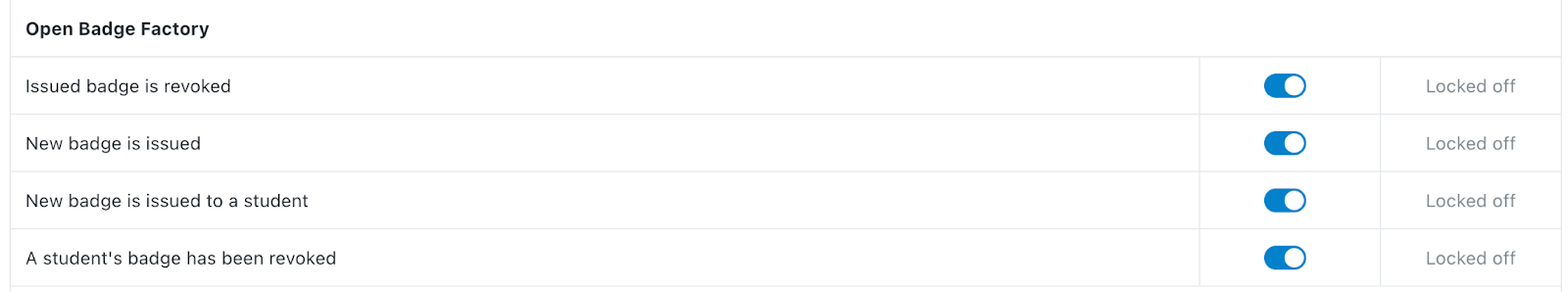 badges or revoked badges (no email notifications since emails are sent by Open Badge Factory). And