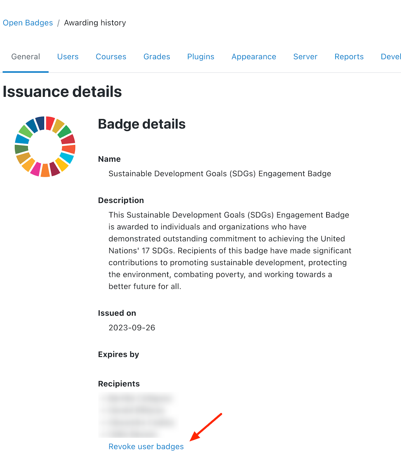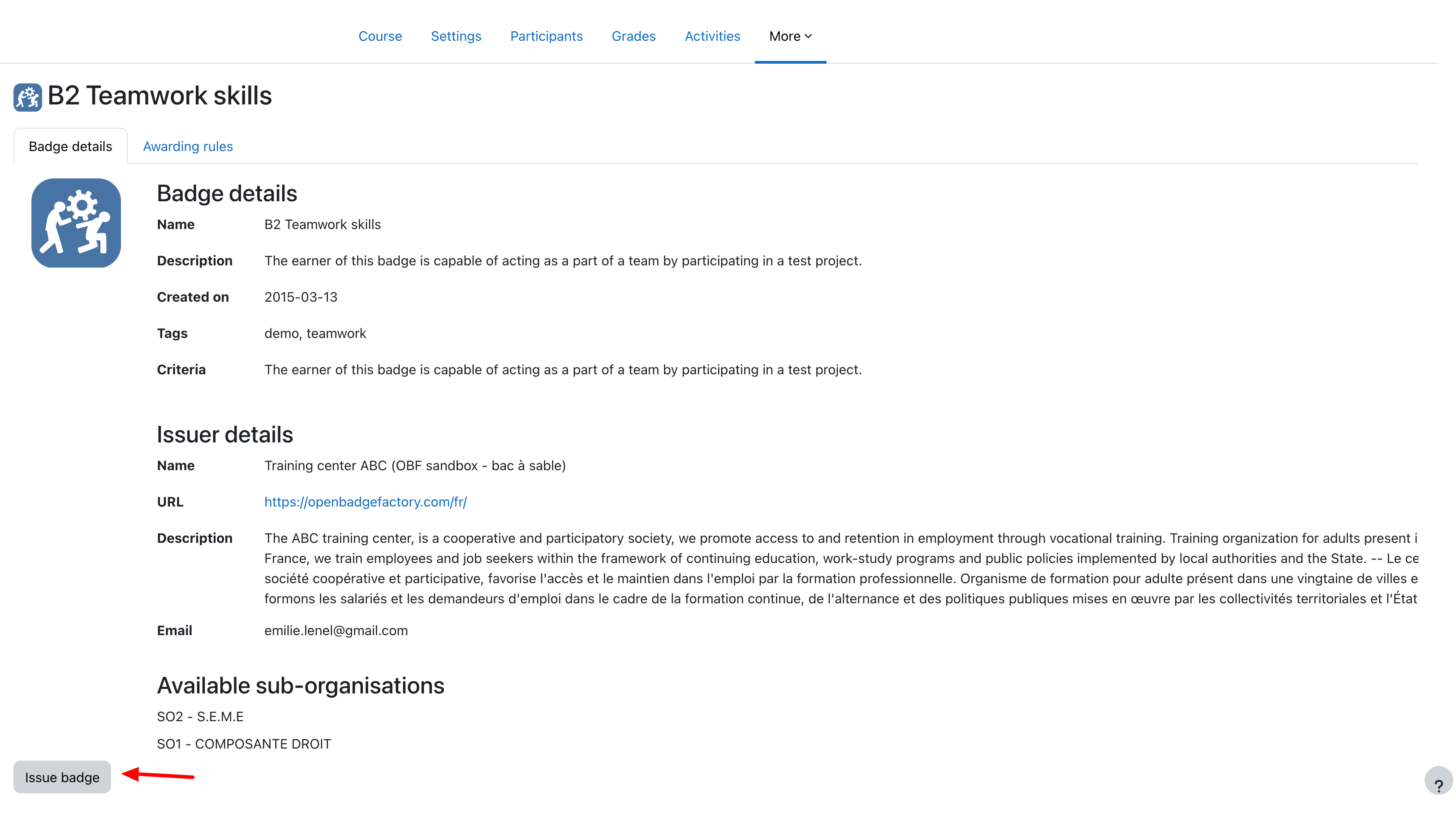 Once the badge has been issued to someone, the issuing event can be seen on the Course awarding