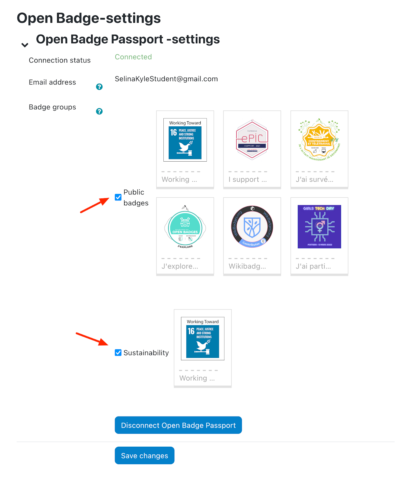 Once the Open Badge Passport is connected, the user can define what badge groups to make visible on his