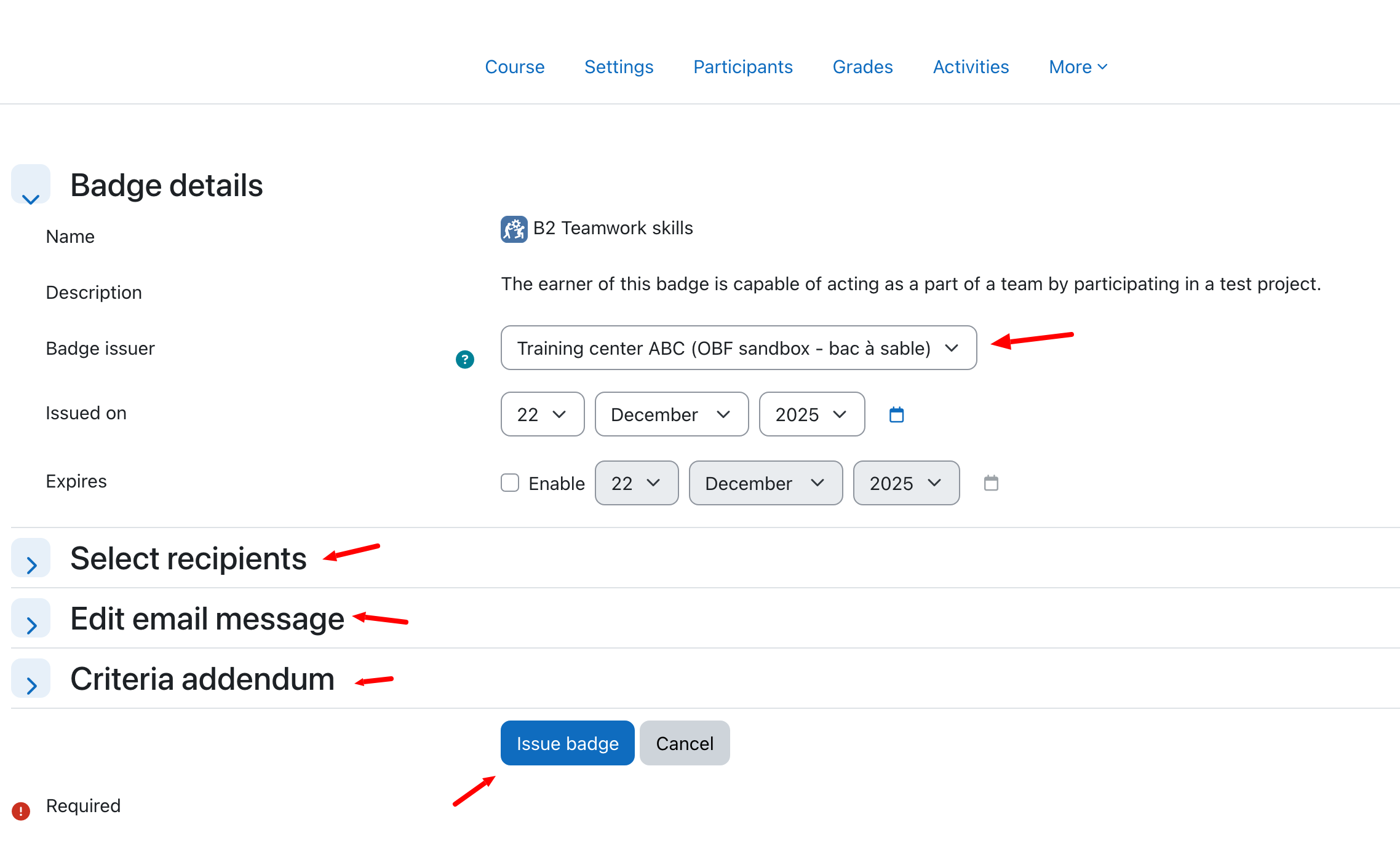 will be sent to the recipients of the badge and add criteria addendum specific to this course. And click Issue