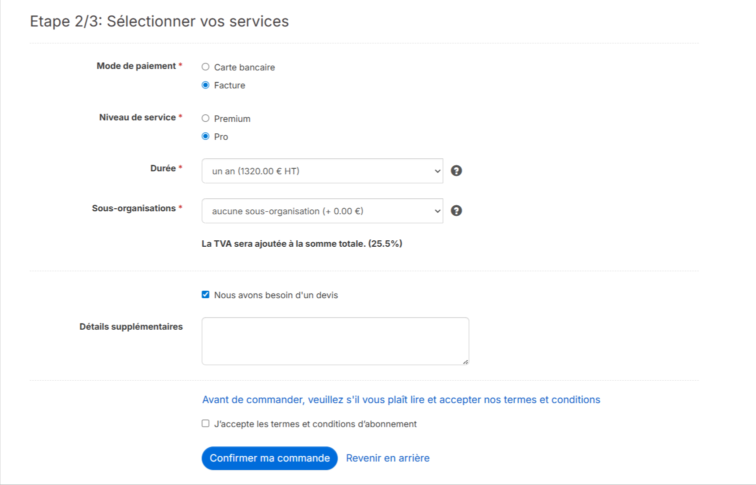 Pour finaliser votre abonnement, vous pouvez choisir entre un règlement sur facturation, un envoi de facture sous Chorus Pro ou un paiement par carte de crédit. A noter que pour la licence de niveau Basic, seul le paiement en carte bancaire est possible.