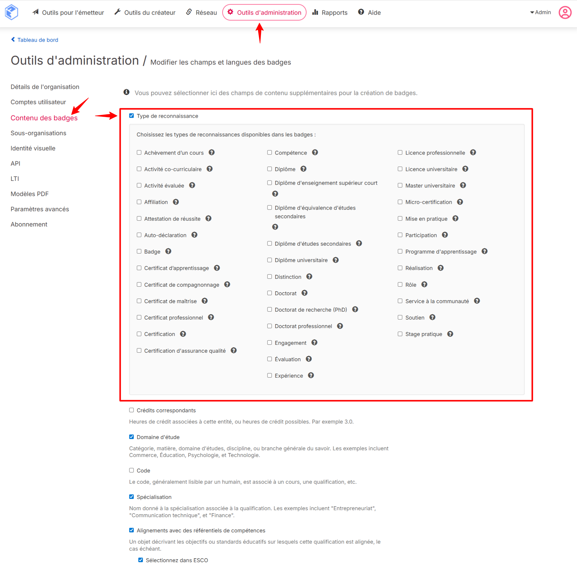 Dans cette section, vous pouvez sélectionner les champs de contenu additionnels disponibles lors de la création des badges :